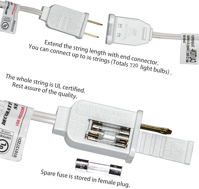 - ❤ ❤ Total length 50 feet, 0.5 Ft lead with male plug, 2.5 Ft spacing between bulbs, 2Ft tail with female connector
