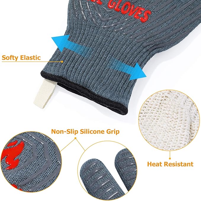 - Enhanced Heat ResistanceOur grilling gloves are lightweight, flexible, and provide higher heat resistance up to 1472°F. The tight aramid fiber distributes heat effectively. No matter what you grab, you won’t feel it, and the fabric fits snugly around the wrist. Which can keep your hands safe in hot conditions.