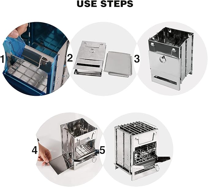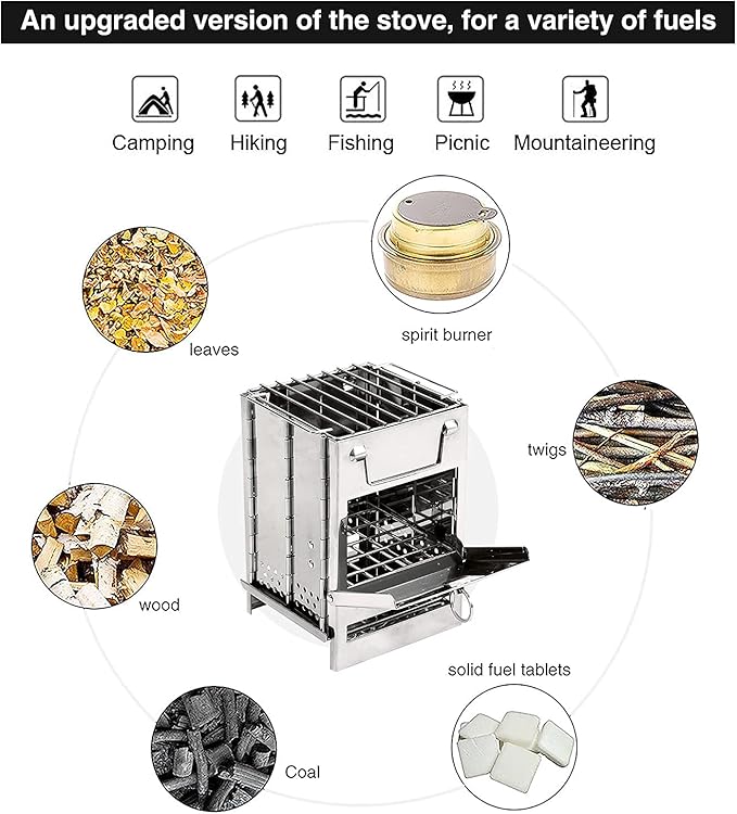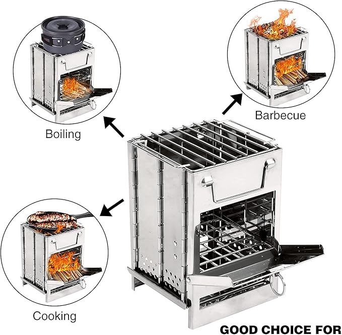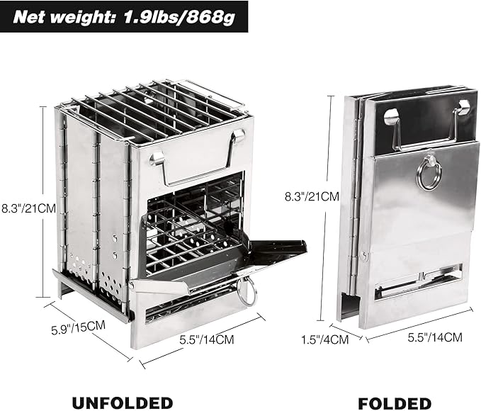- BACKPACKING STOVE: Eat well wherever adventure takes you with this camping stove wood grill. With a compact foldable design and a durable stainless-steel construction, this small wood stove makes it easy to prepare delicious meals and snacks on-the-go.