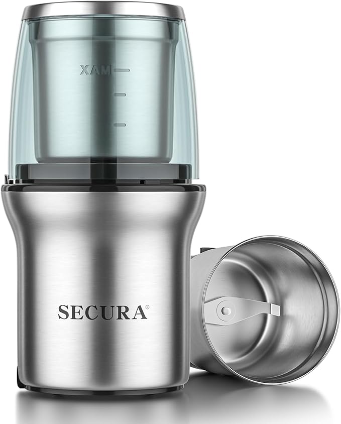 Secura Electric Coffee Grinder and Spice Grinder with 1 Stainless Steel Blades Removable Bowl, Dry Grinding