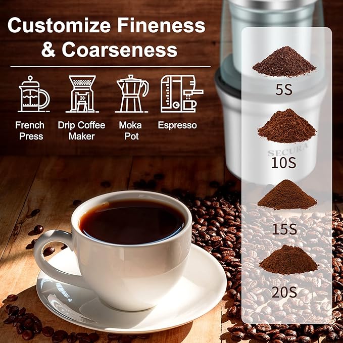 - Large Capacity & Multipurpose: Secura coffee grinder electric can grind up to 2.5oz/70g coffee beans- enough for 12 cups of coffee. Our coffee grinder electric can basically meet all your grinding needs, likes spices, herbs, grains, nuts, and more