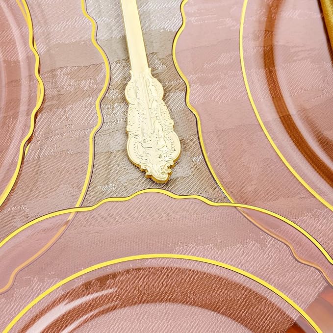 - CONVENIENT TO USE: Compared with metal products, our clear pink plates and gold plastic cutlery are easier to carry.After party,you don't need to wash the dinnerware. You can discard it at any time when you use up. And the material is recyclable,more environmentally
