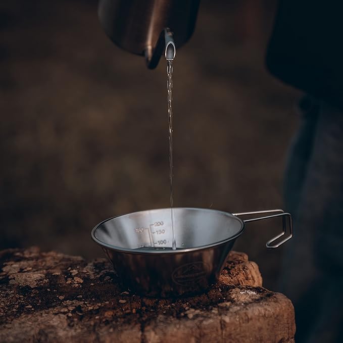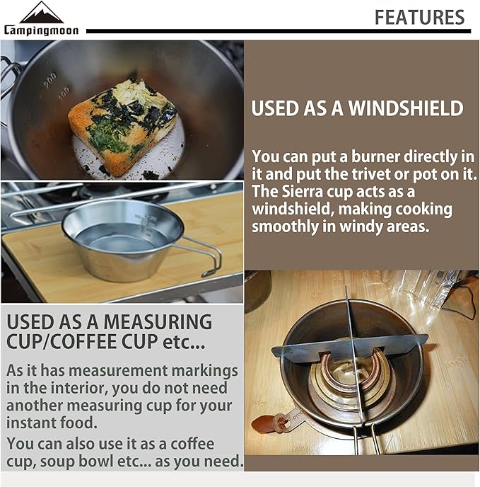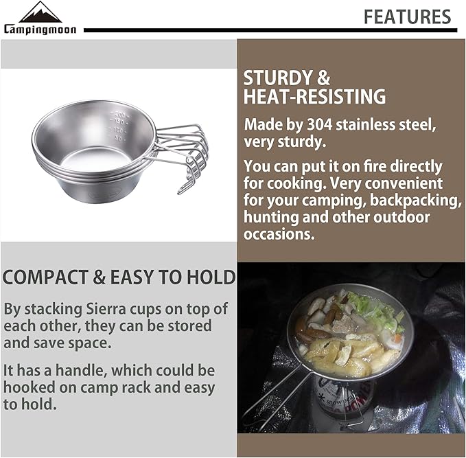 - 【STURDY & HEAT-RESISTING】CAMPINGMOON sierra cup is made by 304 stainless steel, very sturdy. You can put sierra cup on fire directly for cooking. CAMPINGMOON sierra cup is very convenient for your camping, backpacking, hunting and other outdoor occasions.