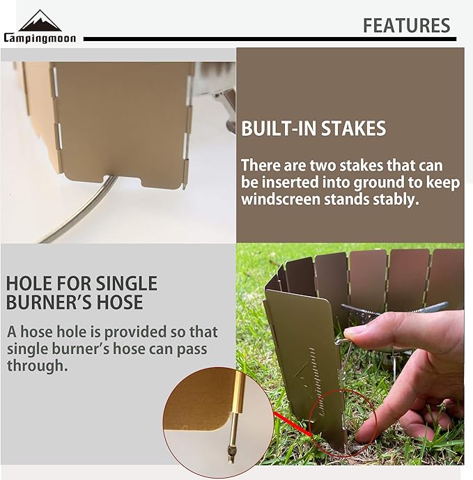 - 【BUILT-IN STAKES】There are two stakes on this stove windscreen that can be inserted into ground to keep windscreen stands stably.