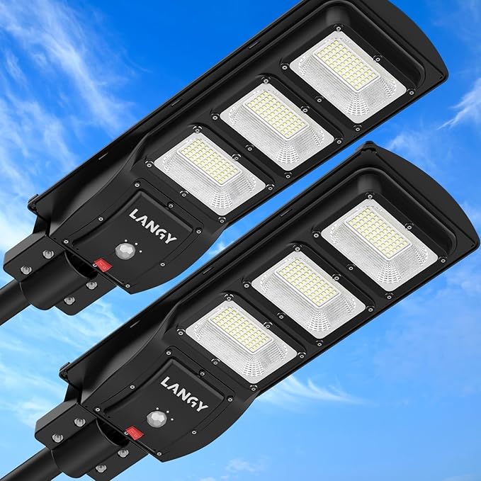 - 【HIGH EFFICIENCY SOLAR STREET LIGHT】LANGY Solar street lights outdoor waterproof is made of high material ABS, sturdy and durable, IP67 waterproof. The solar parking lot lights commercial adopts 6V/15W high efficiency solar panel, which can convert 25% of solar energy into electricity, equipped with 18000 mAh high capacity battery with stable voltage to ensure the safety of you and your family