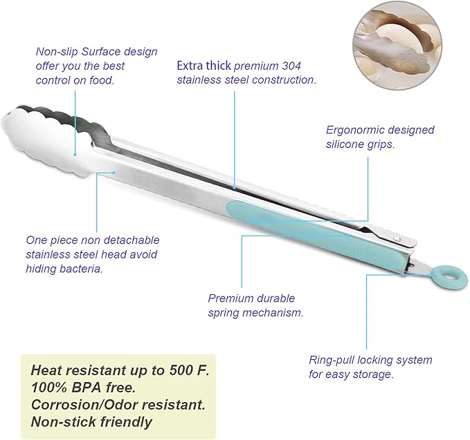 304 Stainless Steel Kitchen Cooking Tongs, 14" and 16" Set of 2 Sturdy Grilling Barbeque Brushed Locking Food Tongs with Ergonomic Grip, Aqua Sky