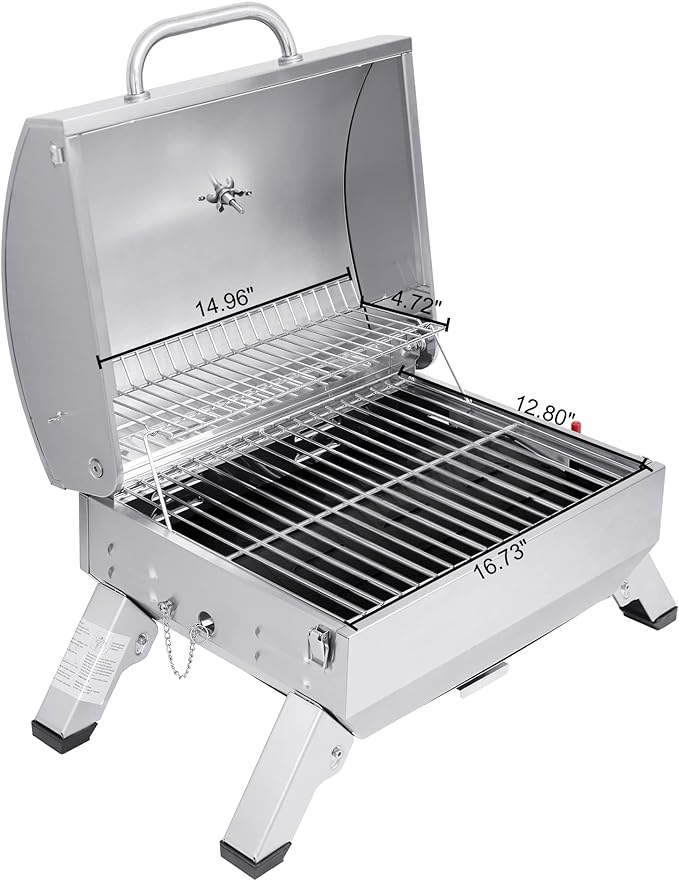 Royal Gourmet GT1001 Stainless Steel Portable Grill, 10000 BTU BBQ Tabletop Gas Grill with Folding Legs and Lockable Lid, Outdoor Camping, Deck and Tailgating, Silver