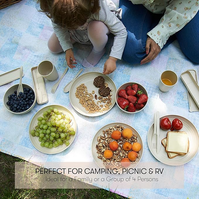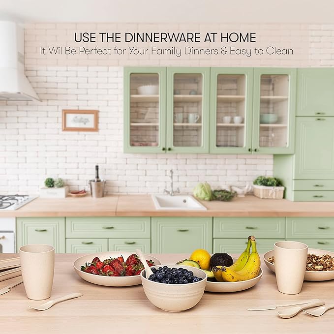 - Multipurpose Dinnerware - Our reusable dishes set for 8 are made for every occasion and will not only be great for home and kitchen use, but also convenient for an rv or camper, a picnic, BBQing, camping, work, school and much more. The unique design allows for easy compact storage as well. You can't go wrong with our wheatstraw dinnerware set.
