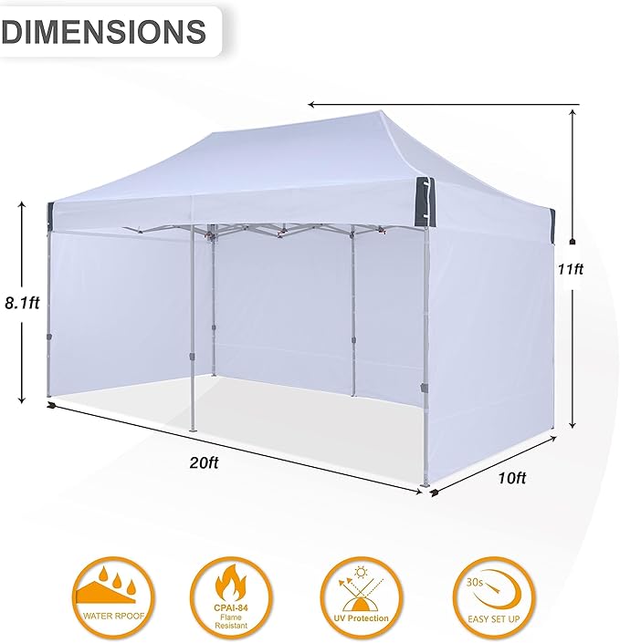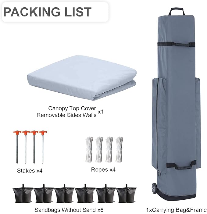 - ๐Packing List๏ผ1 10x20 Pop Up Canopy Top Cover and Canopy Frame + 4 10ft-Removable Side Walls + 4 5ft-Side Walls + 1 Carrying Bag + 6 Sand Bags without sand + 4 stakes and ropes.