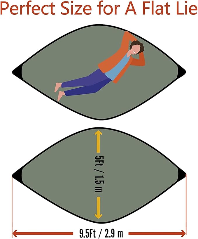 - Perfect Size for A Flat Lie: Want to a comfortable diagonal Lay? This portable hammock size is 9.5ft *5ft.Most of the campers confirmed this is a perfect size for their adventures. No too small , or even too short. You can sleep at about a 45 degree angle to the support lines to get a flater lie