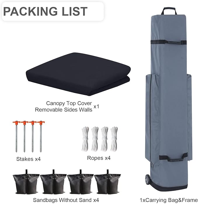 - 👍Packing List:1 10x10 Pop Up Canopy Top Cover and Canopy Frame + 3 Removable Side Walls(10ft) + 2 Door Walls(5ft.) + 1 Carrying Bag + 4 Sand Bags without sand + 4 stakes and ropes.