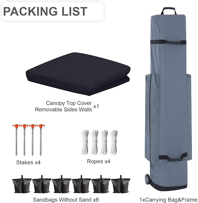 - ๐Packing List๏ผ1 10x20 Pop Up Canopy Top Cover and Canopy Frame + 4 10ft-Removable Side Walls + 4 5ft-Side Walls + 1 Carrying Bag + 6 Sand Bags without sand + 4 stakes and ropes.