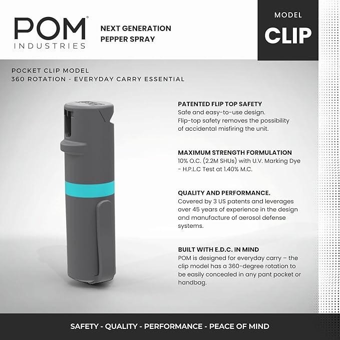 POM Pepper Spray Pocket Clip, Quick Flip Top Safety, Maximum Strength OC Formula with UV Marking Dye, Safe Compact and Tactical Design for Everyday Carry, 25 Bursts, 10 ft Range, 0.5 fl oz
