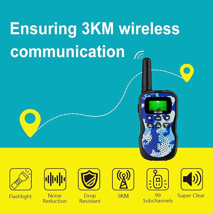 - 【PROFESSIONAL DESIGN】: Supported 22 main channels, ensuring 3 KM wireless communication(outdoor open ground). Broadcast to one or multiple units, ability to use different channels.The build-in led Flashlight can be used as night light as well as the emergency light,LCD backlit display make it more convenient to use or play at night, 1.2m drop resistant.Perfect for kids to do outdoor adventures.