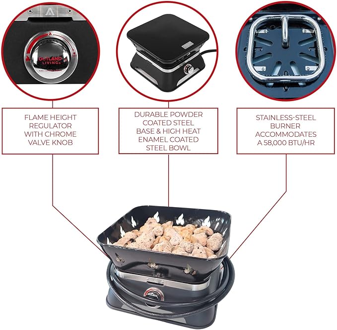 - SIGNATURE OUTLAND LIVING QUALITY: Durable high-quality steel construction with a protective enamel finish for dependable longevity with a superior stainless-steel burner, fasteners and contemporary decorative belt make for a long lasting, good looking firecube. Make new memories with friends, in comfort and style anywhere outdoors, with the Outland Living Firecube