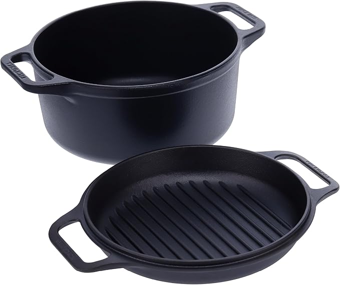 - MADE FOR GREAT MEALS: Our cast-iron pot set comes with a skillet that can be used for cooking or used as a lid. Both items feature large loop handles and flat, wide bottoms for more even cooking, and the skillet features built-in ridges for easy grilling.