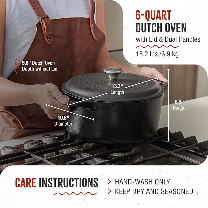 - EASY TO USE: Give your cooking an upgrade by using cast-iron cookware. Durable, rugged, and made to last, our Cast-Iron Dutch oven is easy to use and allows the perfect amount of steam and moisture flow for more evenly cooked food.