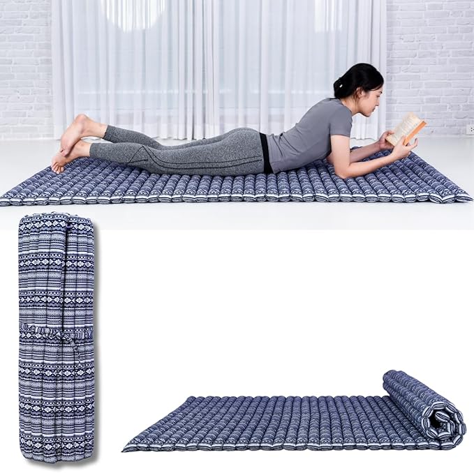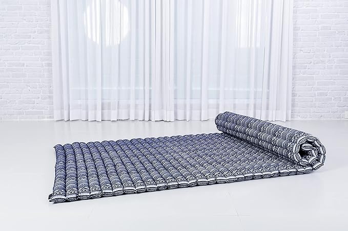 Leewadee - Kapok Roll Mat – Handcrafted Folding Sleep & Relaxation Mattress from Thailand, Ideal as Guest Bed, Camping Mat, Yoga Mat or Traditional Futon, 75 x 39 inches, Blue White