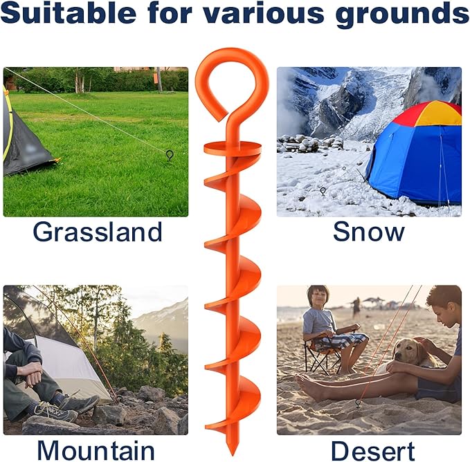 - 360 Degree Spiral Design: The tent stake is 11.81 inches long,attached with 5MM diameter multi-layer metal sheet.Compared with other tent stakes on the market, it has a wider coverage area and can be fixed in the soil and provide exceptional holding power by multiple ruler shaped metal sheets.