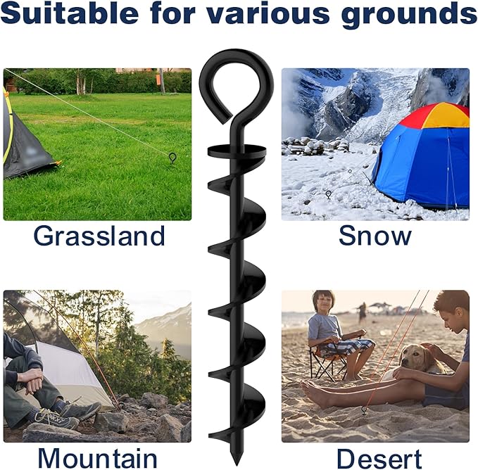 - 360 Degree Spiral Design: The tent stake is 11.81 inches long,attached with 5MM diameter multi-layer metal sheet.Compared with other tent stakes on the market, it has a wider coverage area and can be fixed in the soil and provide exceptional holding power by multiple ruler shaped metal sheets.