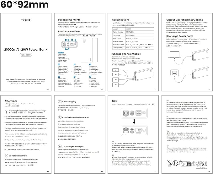 - Safety & Multi-Certified: The power bank 20000mah has a built-in lithium polymer battery core that provides higher safety. It will provide automatic identification technology that allows various compatible devices to be charged in the fastest and safest way. Our portable phone charger has passed CE, FC, RoHS, and other certifications.