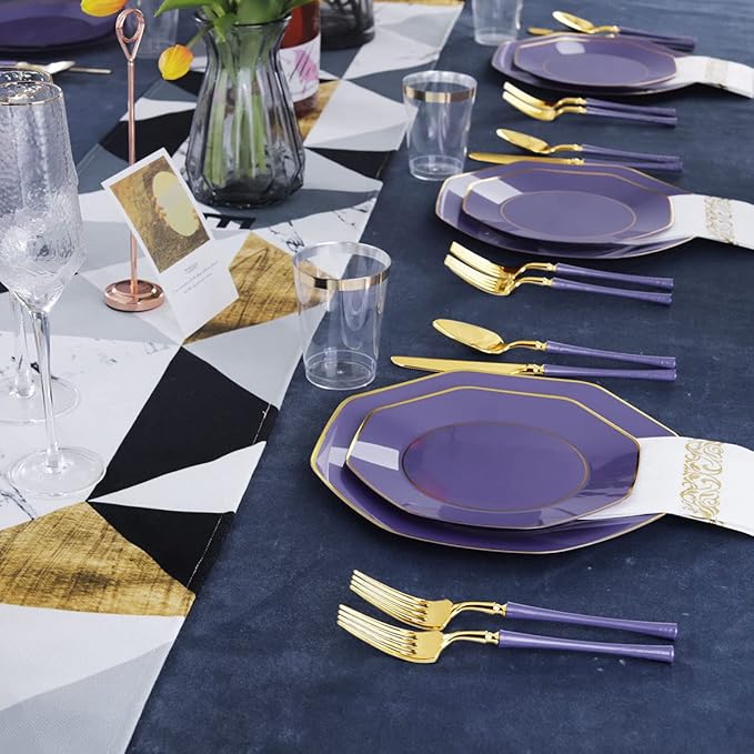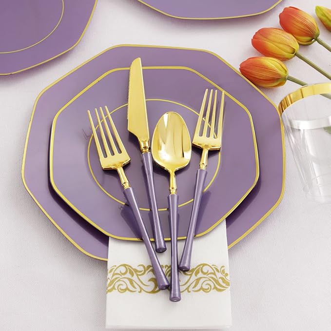 - UNIQUE DESIGN: The octagonal outside and the circular inside make these purple disposable plates look more elegant,and gold disposable cutlery with purple handle is longer and more sturdy than regular silverware.Delicate design as Mothers Day plates and napkins are also very suitable