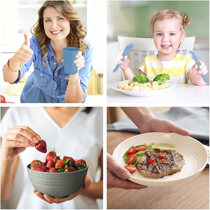 - 🌾【Kid-friendly】These dinnerware sets are made of natural wheat straw fiber and food grade pp, without any harmful ingredients. 100% non-toxic, BPA free and odorless. Safe wheat straw dinnerware sets to be used as toddler plates and bowls set.