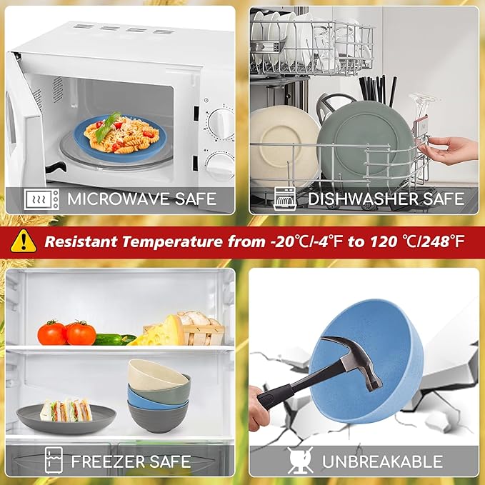 - 🌾【Dishwasher & Microwave Safe】Shopwithgreen wheat straw dinnerware sets are dishwasher safe to save your precious time. Also are microwave safe. Temperature resistance reaches up to 248℉(120℃). Also easy to clean the plates set with hot water and soap.