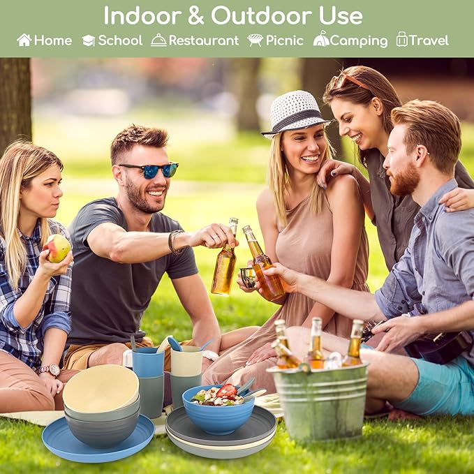 - 🌾【Multiple-Use Dishes Set for 4】Our reusable plates and bowls sets are lightweight and stackable to be used indoors and outdoors like home, school, dorm and office, party, picnic, camping, RV, etc, which are great alternatives for traditional plastic plates, bowls and cups. Suitable for kids, toddlers, children and adults.