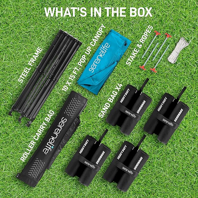 SereneLife SLGZ15SB Pop Commercial Instant Shelter-Waterproof Polyester Tent with Portable Wheeled Carry Sand Bag, 10 x 15 ft. (Sky Blue), 10x15