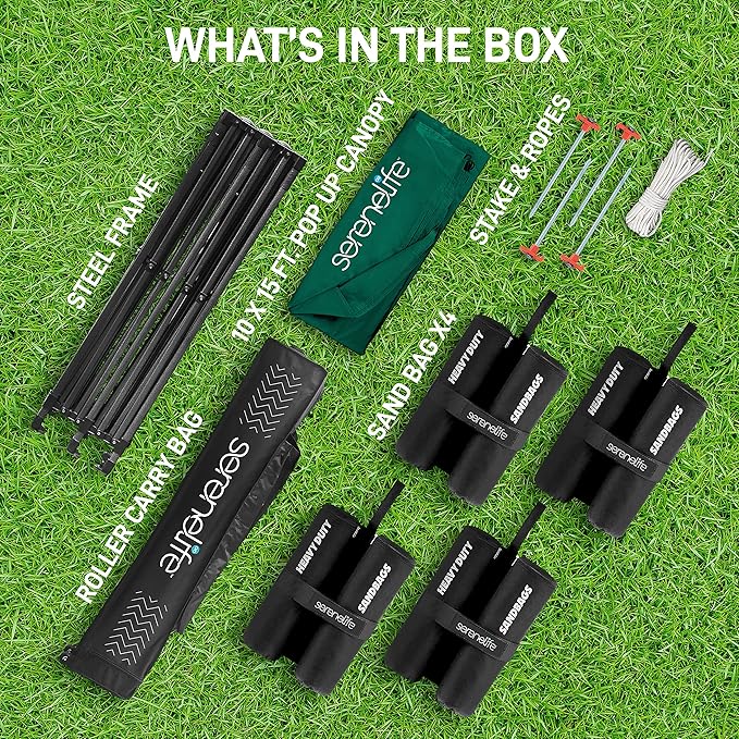 SereneLife SLGZ15FG Pop Commercial Instant Shelter-Waterproof Polyester Tent with Portable Wheeled Carry Sand Bag, 10 x 15 ft. (Forest Green), 10x15