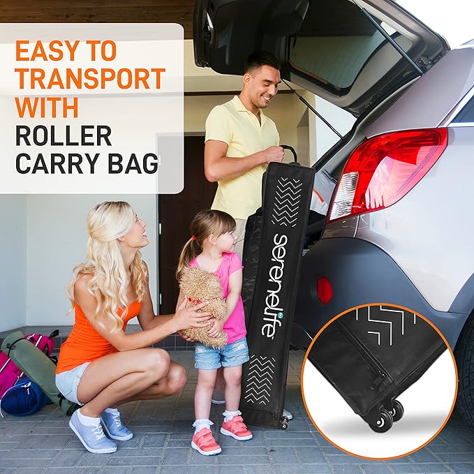 - WHEELED CARRY BAG: This heavy-duty canopy set comes w/ wheel roller carry bag for portability and easy storage, (4) 35 lb sandbag, & stake & ropes. Perfect for beach, camping, backyard party, picnic, garden wedding event, outdoor sport & more