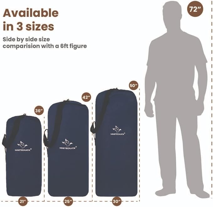 - 【Available in 3 Sizes & 5 Colors】Choose from 3 sizes: Standard Size: 36" x 10" x 10", 36" (Height) x 10" (Base Width) x 10" (Depth) | 21" Flat Width (59L), Large Size: 42" x 12" x 12", 42" (Height) x 12" (Base Width) x 12" (Depth) | 25" Flat Width(99L), and Extra Large Size: 50" x 15" x 15", 50" (Height) x 15" (Base Width) x 15" (Depth) | 30" Flat Width (184L), offering ample space for any gear or equipment. Whether you need an extra large duffle bag for travel or a mid-sized bag for daily use.