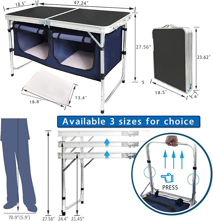 - Easy to set easy to fold: The folding table comes with quick set up and takedown table top, minor assembling steps of two storage bags. Super easy to adjust the camp table’s height by pressing the bush button, 3 height settings suit a diverse range of tasks.