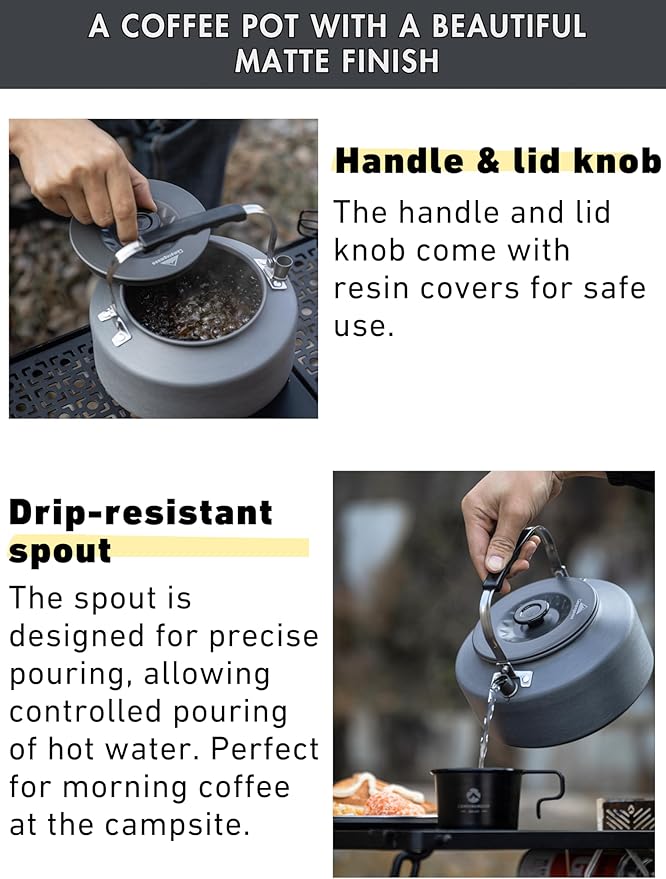 - This ultralight camping coffee kettle processed with a hard alumite treatment with corrosion resistance, which is sturdy and hard to get corrosion.