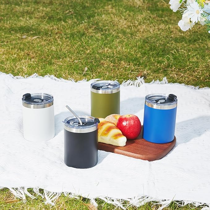 MEWAY 12 oz Lowball, Tumbler Stainless Steel Double Wall Vacuum Insulated Mug with Straw and Lid, Cleaning Brush ,Durable Powder Coated Insulated Coffee Cup for Cold & Hot Drinks (White, 12 pack)