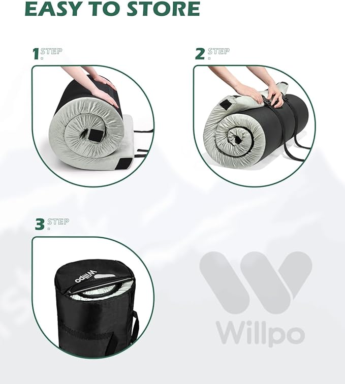 - 【CertiPUR-US Memory Foam Inner Core】High-density base foam prevents sagging, pressure-relieving memory foam adapts to body shape, airflow layer reduces heat. NO MORE back pain or annoying discomfort from rocky terrain from Willpo sleeping pad.