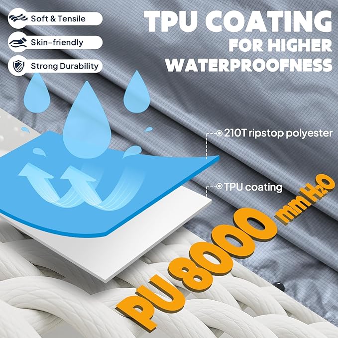- Waterproof and Sturdy Material: The rain poncho is made of 210T ripstop polyester + TPU coating, this rain poncho is PU8000MM waterproof.To enhance the waterproofing capabilities of a rain poncho,we use techniques such as seam sealing or taping to ensure that water cannot seep through the seams.It comes with a drawstring hood, hook and loop fasteners along the sides ensures the optimal fit,which is good for protecting your head and face.