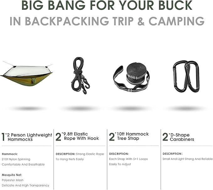 - Large size and Zipper design: this double hammock size is 110’’x55’’ (280*140cm) , has a lot of space enough to fit two adults or a couple of kids, comfortably holds up to 595 pounds(270kg) and can be zip with the mosquito net or unzip the zipper as a normal tree hammock as you like.
