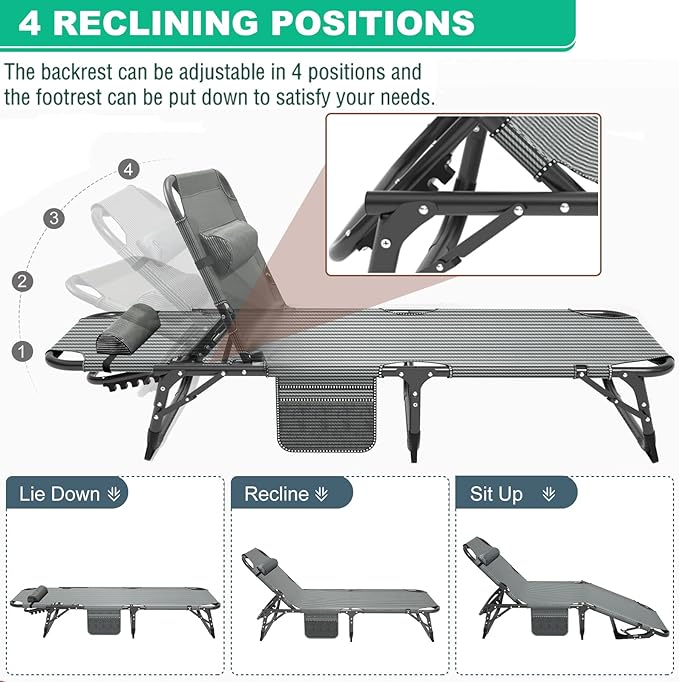 - DESIGNED FOR COMFORT: With a perfect balance of a firm and soft surface, our chaise lounge boasts an ergonomic design to help reduce muscle tension and stress; The beach lounger chair has a side pocket, to place your phone, books or keys; the pillow is detachable, can be adjustable up and down or removed based on your own needs;