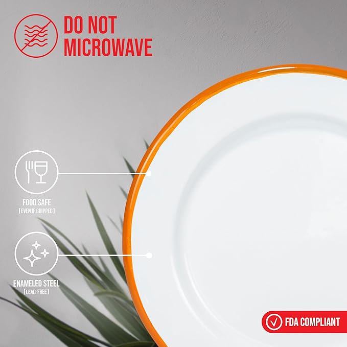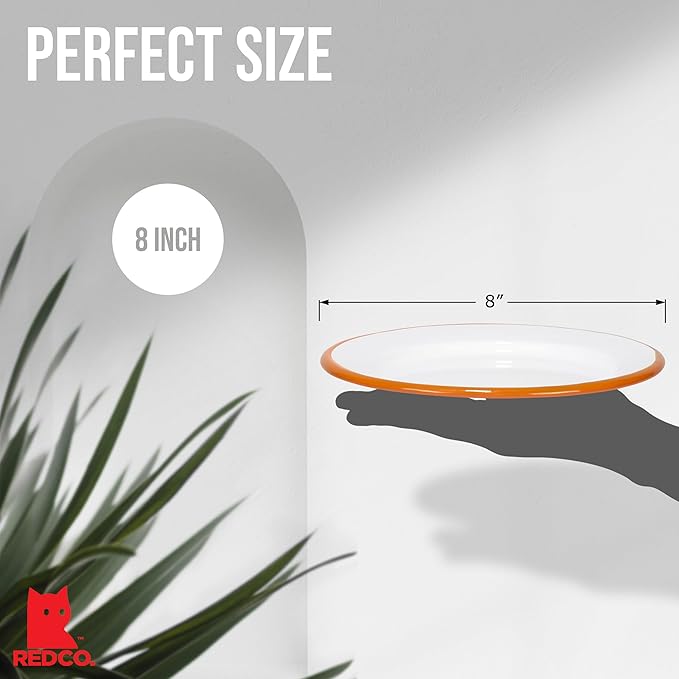 Red Co. Set of 4 Enamelware Metal Classic 8" Round Salad Plate, Solid White/Orange Rim