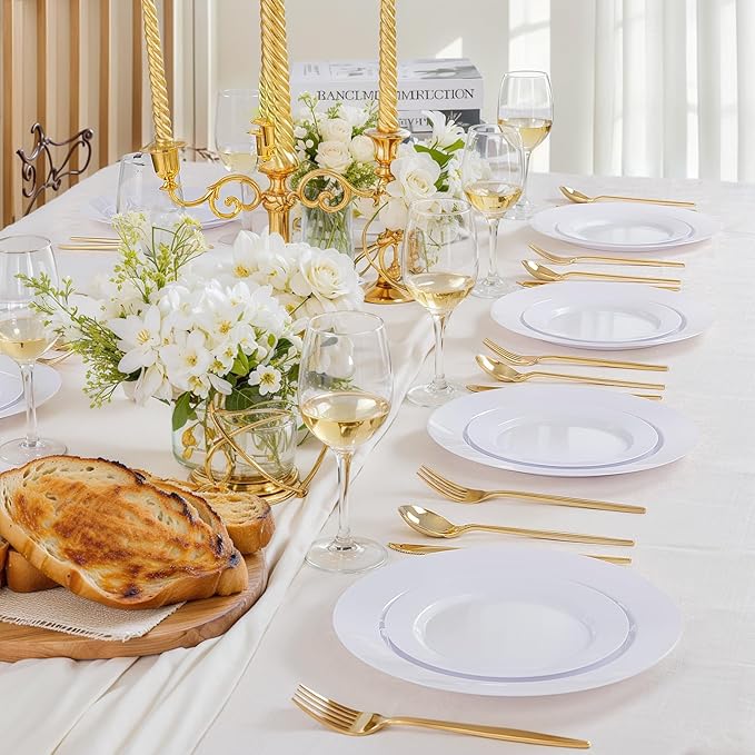 - 【VALUE PACK】This package is complete for 60 guests, so you’ll have enough to go around at home or at your next event. These white party plates can match gold silverware, silverware and any colors silverware well.And make your party more outstanding.