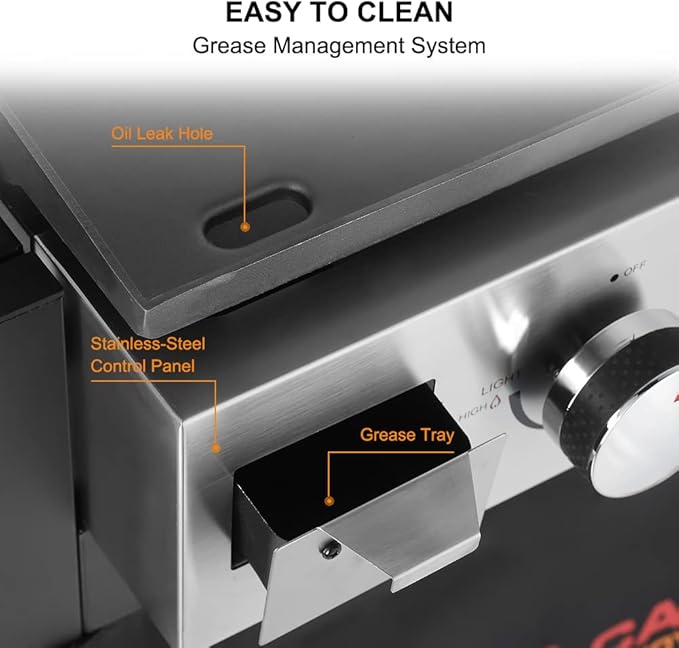 - EASY TO CLEAN:Flat top griddle (not easy to stick) and grease cup are detachable for washing. Cleanup is fairly easy that using a scraper, soap water and paper towels after use,perfect as outdoor camping griddle