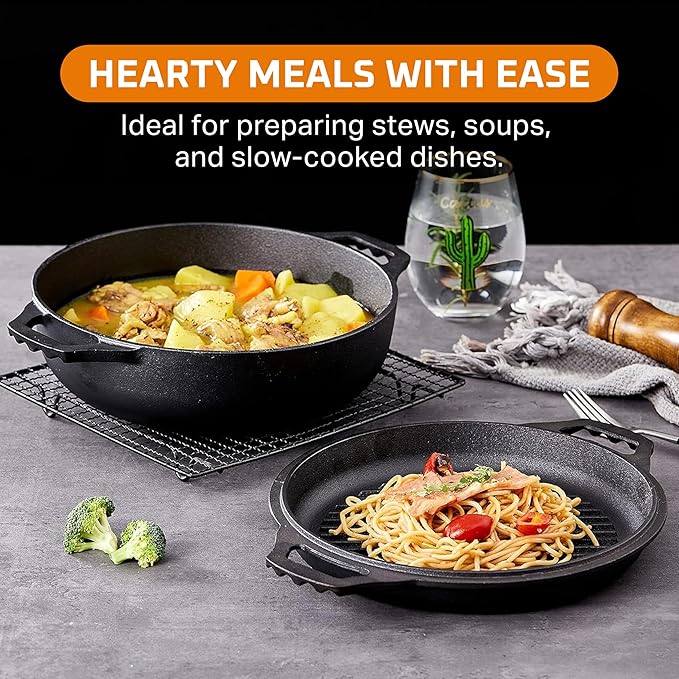 - 2-in-1 Versatility: Cook with confidence using a lid that doubles as a cast iron griddle; ideal for flipping pancakes, grilling meats, or baking bread using one smart braising pan with lid oven safe