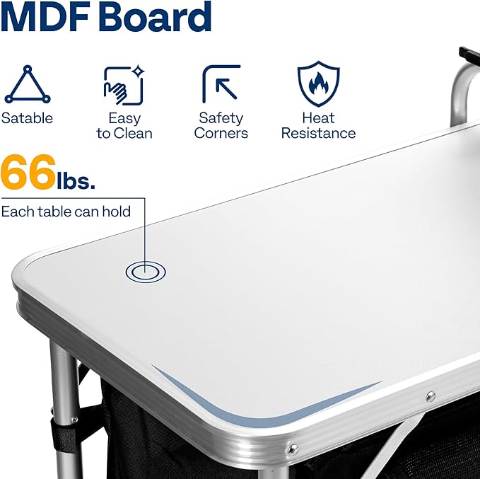 - RELIABLE MATERIAL - The X-shaped aluminum bracket and adjustable rubber anti-slip foot pads add stability and steadiness to the camping table; And the rust-resistant material makes the table extremely durable; 2 side tables and an operating table can hold up to 66 lbs each