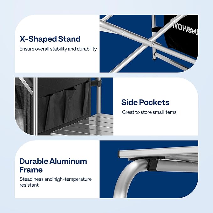 VIVOHOME Folding Camping Kitchen Station Table with Storage Organizer, 2 Side Tables, Stainless Steel Windscreen, Outdoor Portable Cook Station for BBQ, Picnics