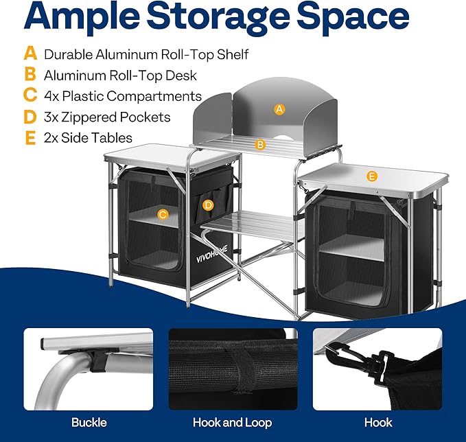 - LARGE STORAGE SPACE - Our kitchen table consists of an aluminum roll-top desk, an aluminum roll-top shelf, 2 side tabletops, and 4 built-in plastic compartments; The 2 600D PVC zipper storage shelves with mesh panels provide visibility and can store various cookwares, preventing pets from accessing accidentally; You can also put an ice maker, drinks, snacks, cups, plates, and blender on the spacious desktop