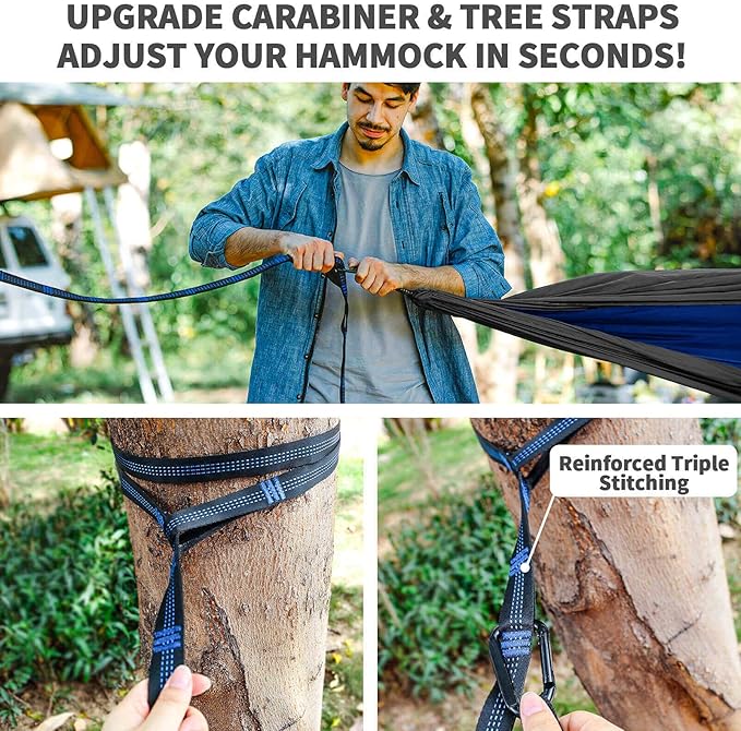 - 【Camping Hammock With Bug Net】The outdoor hammock is designed with a built-in bug net. Small and dense nets effectively stop the bites and harassment of mosquitoes or even the smallest pests. The attached elastic string will help keep the bug net up and away from you. 2-in-1 reversible design, flip the hammock over when you don't need the mosquito net