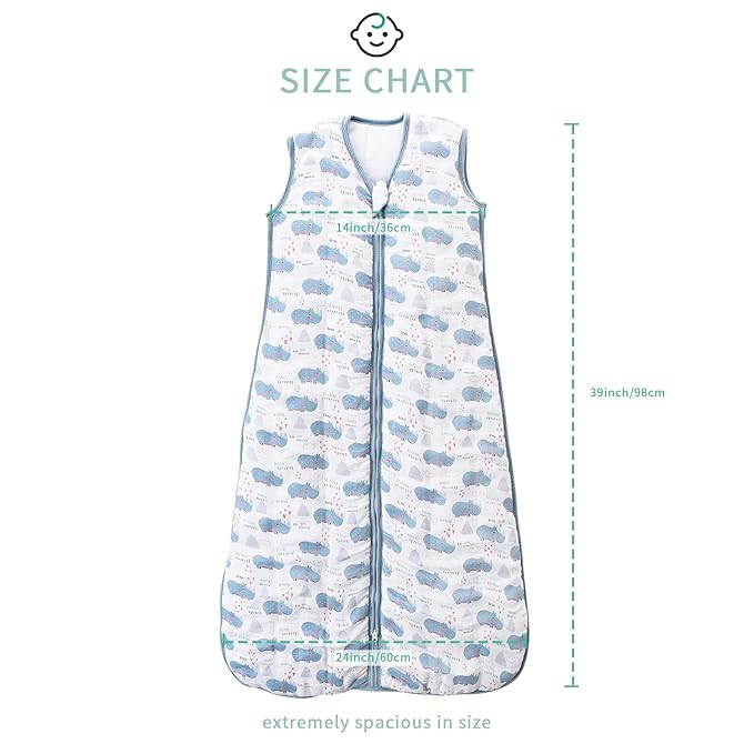 - Size and Patterns: The sleeping bag is 39" long and suitable for 2-4T toddlers. Please refer to the size chart for more information. For both boys and girls, we offer three patterns to choose from: rhinoceros, cars, and small fish. Suitable warmth for your baby in room temperature between 61℉-68℉