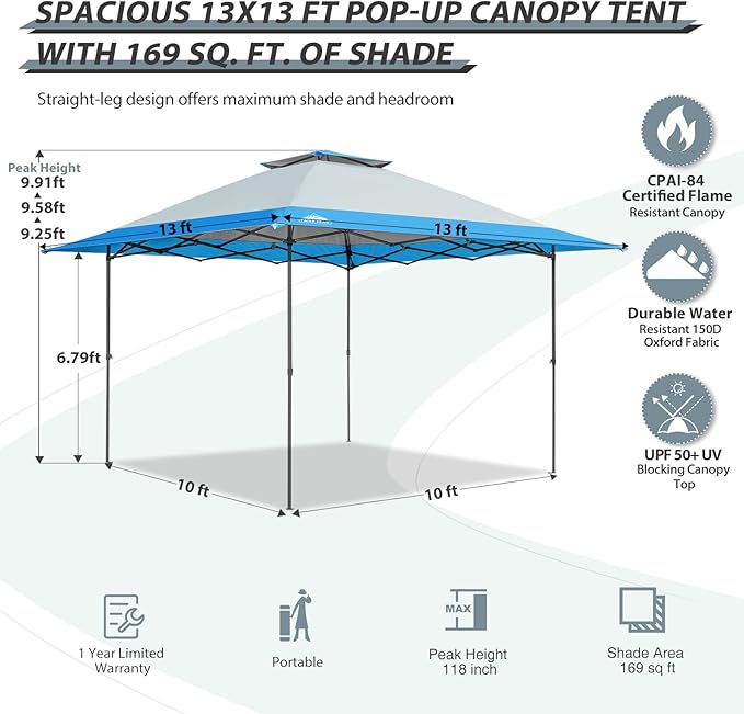 EAGLE PEAK 13x13 Straight Leg Pop Up Canopy Tent Instant Outdoor Canopy Easy Single Person Set up Folding Shelter w/Auto Extending Eaves 169 Square Feet of Shade (Light Blue)